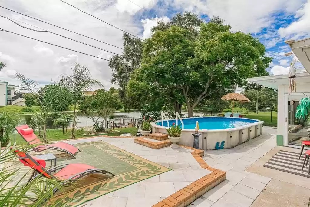 This beautiful LAKEFRONT HOME features 2 bedrooms and 2 full baths. The oversized fenced in backyard has an above ground POOL and a patio deck with a Tiki Bar to entertain friends and family. The back yard FIRE PIT area is a cozy place to sit, while discovering all of nature’s wildlife right in your own backyard overlooking the lake. The master bedroom features a en-suite bathroom, walk-in closet and a ceiling fan. The second bedroom has mirrored closet doors and views of the lake and pool area. The kitchen has stainless steel appliances and an entrance into the one car garage. In the garage you’ll find lots of storage space and a washer/dryer. The dining room and living room which overlook the pool area have fabulous views of the lake as well. As you walk through the pocket sliding doors out of the living room into the bonus room, it leads you right into the your backyard. The bonus room has an additional 144 sqft, not included in the heated square footage shown in public record. The newly updated Highland REC Center is nearby, right around the corner. Updates include: Roof- 2018, Pool- 2020, Patio Deck- 2020, A/C & Duct Work- 2012, Fire Pit Area- 2020.