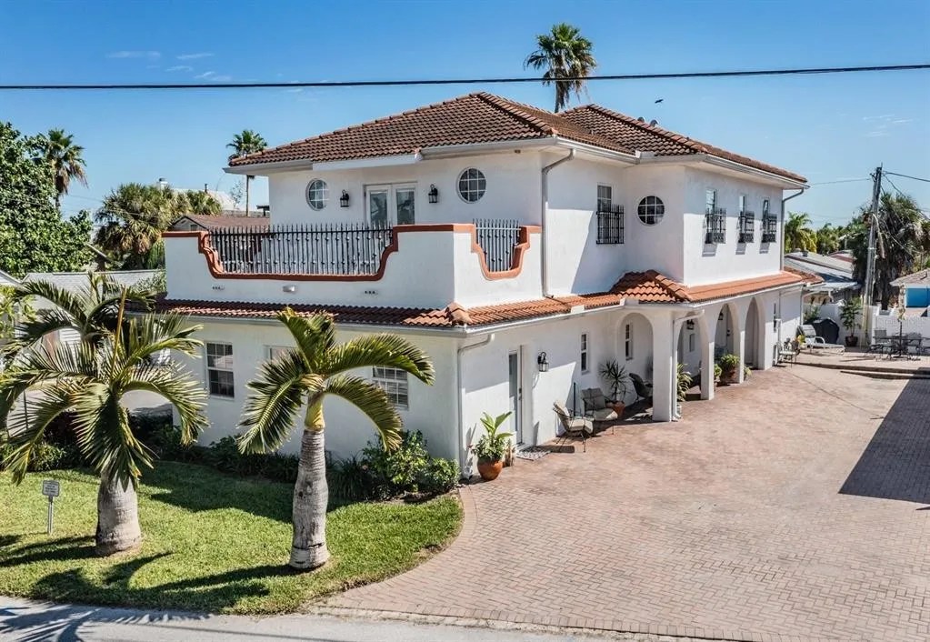 Welcome to Sunset Beach, Treasure Island! Luxury beachfront living is within grasp! This impeccably maintained Duplex is conveniently located just steps from the soft sandy beaches of Florida’s Gulf coast and walking distance from the famous John’s Pass Boardwalk, Caddy’s Bar & Grill, Ka’tiki, and many more dining and entertainment options! Sitting on the corner of Gulf Blvd, this home boasts ideal location and proximity to both beach and intracoastal. Finished in 2005, this 5 bedroom, 4 bath, two-unit property was personally designed for the owner with stunning Spanish Architectural style and is optimized for beach living. A truly versatile property, the first (main) unit includes a 4/3 with roughly 2100sqft, and the second unit is a roughly 500sqft 1/1 complete with its own kitchen and living room. Having friends or family visit? Host them in the coastal inspired ground floor mother-in-law suite and entertain your guests back in the main unit. The first floor welcomes all with its open concept design allowing the living room to flow effortlessly into the kitchen and dining rooms. In your ascent to the second floor you will walk up an elegant hand-carved, Amazonian hardwood staircase, wrapped in wrought iron and accented with moroccan tiles. Upstairs an enormous master bedroom awaits including a spa-esque ensuite bathroom with a jetted tub, large separate shower and double vanity with tons of storage. Wind down the evenings on the Master bedroom’s second floor private balcony overlooking the sunset as it sinks beneath the Gulf of Mexico. With a full laundry room upstairs and a second located off the two car garage, you accommodate both units with ease! The two car garage is perfect for fitting both cars with plenty of storage leftover for your beach chairs and toys. This is the perfect home for your primary residence, a lucrative income property, or the perfect combination of both!