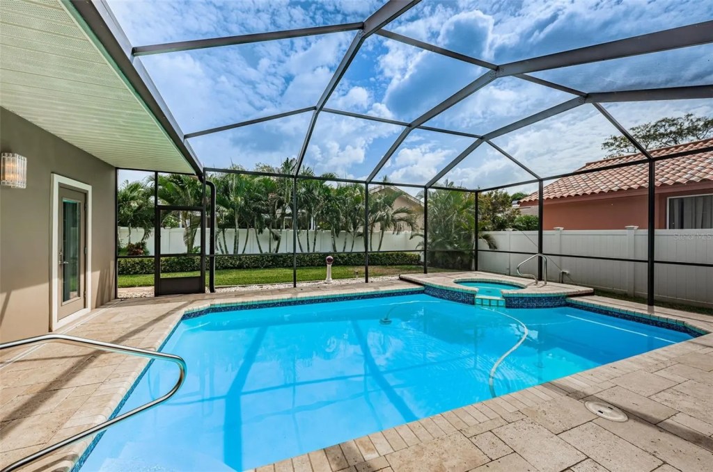 The search is over! Deed-restricted NO FLOOD, NO EVACUATION ZONE Executive 4 bedroom, 3 bath, 3-car garage block home in one of Seminole’s most desirable communities of “Seminole Oak Trails.” Move right into this immaculate split-bedroom home, built by “Happy Homes” in 1991, featuring a high-end red barrel tile roof by Thunderbay, Inc. in 2008, new A/C in 2016, inside laundry room with new upscale washer/dryer, gas fireplace, security system, water softener, ceiling fans, fresh interior paint with crown moldings, and tile & laminate flooring throughout. The highly functional center kitchen is fully equipped with stainless-steel Kenmore and GE appliances, granite counters, ample cabinet space and large breakfast bar. The formal living-, dining-, family room and kitchen overlook an inviting travertine-tiled lanai with solar-heated, caged pool & spa, in private all white vinyl fenced backyard (lot size: 75×120), outdoor kitchen for family barbecues and outdoor fun. His and Hers Walk-in closets in large master bedroom and beautifully remodeled master bath. Two neutral-colored guest baths will need remodeling. Sprinklers are on reclaimed water. Epoxy flooring in garage, pull-down ladder and attic storage, high-impact garage doors, additional fridge, A/C in garage & workbench convey. Home is covered by Super D Pest Control with a termite warranty. A circular driveway and mature, professional landscape offer a lovely curb appeal. The home is located 10 minutes to white, sugary beaches of Indian Shores, walk-in distance to parks (Boca Ciega Millennium Waterfront Park & Seminole City Park with playground and City museum), a number of public and private A-rated schools, new Seminole City Center with movie theater, restaurants, Fitness Center, shopping & entertainment, a 25-minute drive to Tampa International Airport – this property offers the best of Florida living – don’t miss your chance to make it YOUR HOME! (Furniture is negotiable – sold separately, ask for details.)